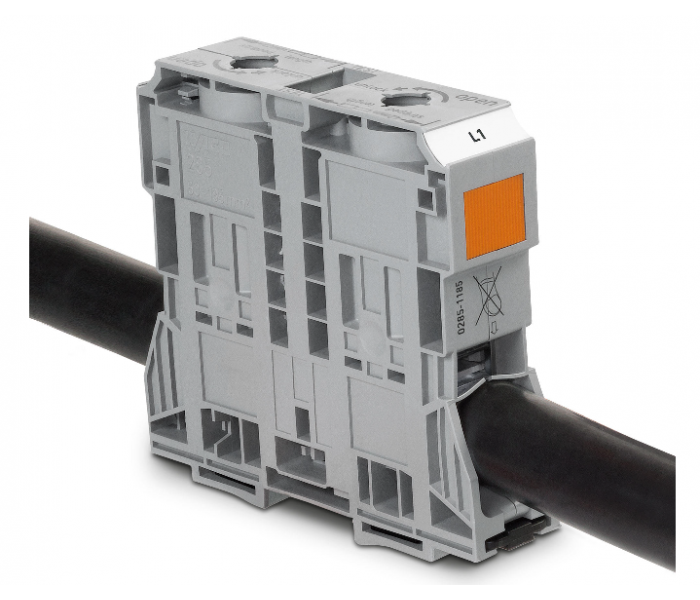大電流軌裝式接線端子(POWER CAGE CLAMP)適于連接截面積高達185 mm2 (350 kcmil)的導線,可提供35、50、95和185 mm2 (2, 1/0, 4/0 AWG; 350 kcmil)類型的接線端子供您選擇。以上類型產品可通過固定耳安裝到DIN導軌或直接固定到安裝板上。