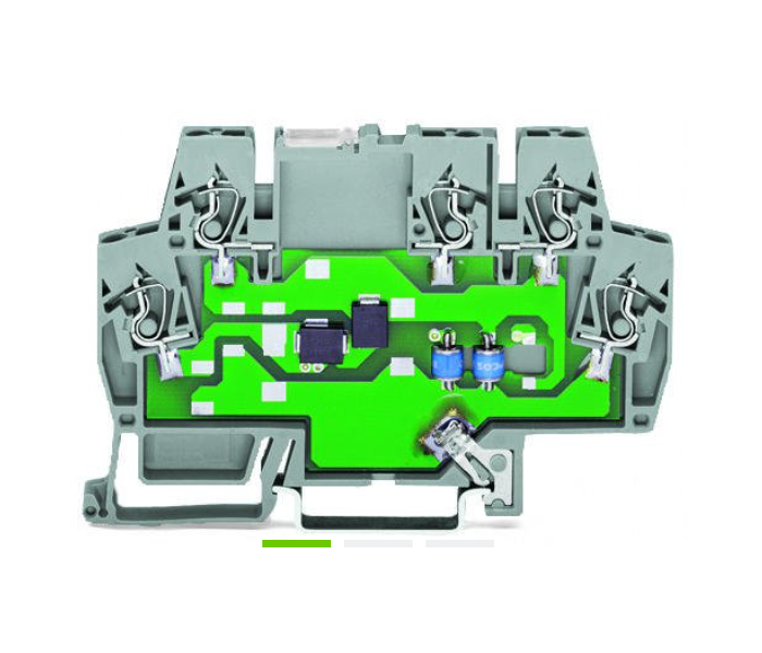 Overvoltage protection is also possible for DIN-35 rail-mount terminal blocks. Multi-stage surge arresters in rail-mount terminal blocks (792-80x Series) of just 6 mm width ensure cost-effective protection for control and bus technology (e.g., LON? network, PROFIBUS network, binary signals).